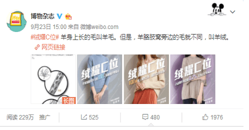 在线上,天猫羊绒品类日活动为顺应年轻消费者的独特品味,用创意新颖的“羊绒大讲堂”再加入@博物杂志 从羊绒的来源、保暖性、制成羊绒品的工艺过程等多角度的重量级科普文《羊绒是羊的腋毛吗?》组成线上科普阵地, 深入浅出地传递出羊绒不同于羊毛的高品质品牌概念。