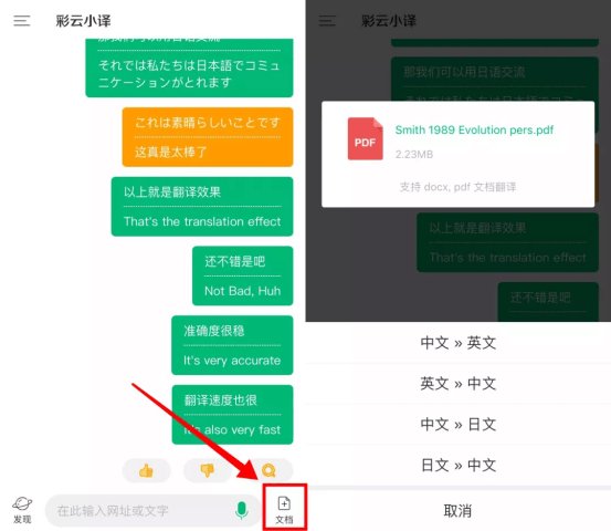 在App Store独占鳌头后,彩云小译开启了自己的迭代之旅。6月份,彩云小译推出了免费使用的网页版,与APP同步开放文档翻译功能,并加入中日英三语互译功能,用户可以将docx/pdf文档直接上传致网页或APP,翻译后导出逻辑通顺、完整的docx/pdf文档,也可以添加彩云小译网页版到收藏夹,或者使用APP打开外网链接,实现外文网站、文献同步翻译,胜任功能强大的外网浏览器。紧接着在APP端,彩云小译发布了全新的“应用文档一键翻译”功能,QQ、微信等常用聊天软件中发来的文件,都可以直接跳转彩云小译APP翻译并导出。这一突破性的功能不仅让用户告别单独购买翻译机的烦恼,更是众多翻墙派、论文党、留学生的福音。